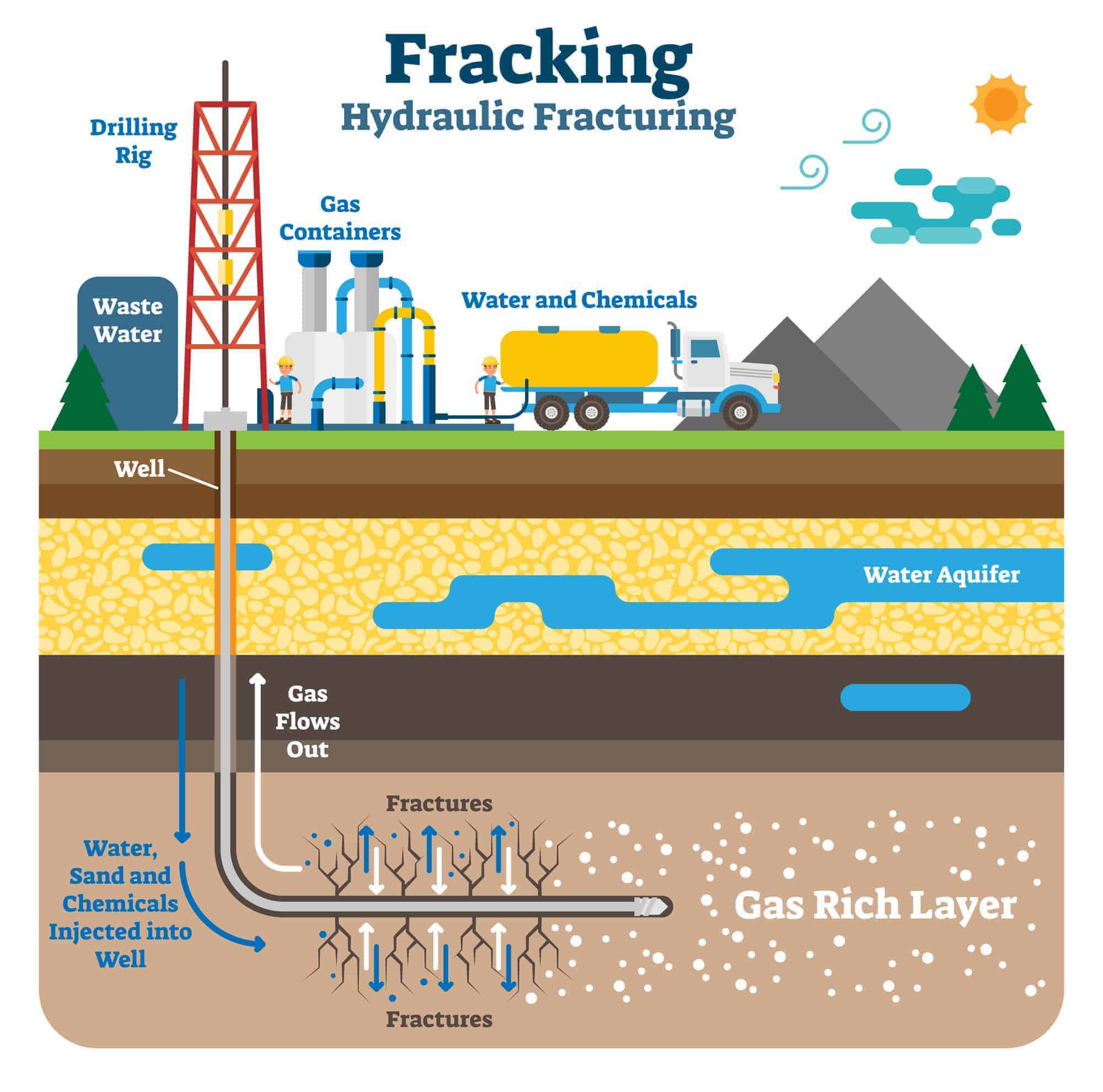 Hydraulic fracturing, commonly known as fracking, develops oil and gas wells by injecting water, sand, and chemicals under high pressure into the bedrock.